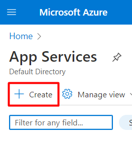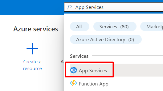 To create an App Service, login into Azure Portal, and search for “App Services”: