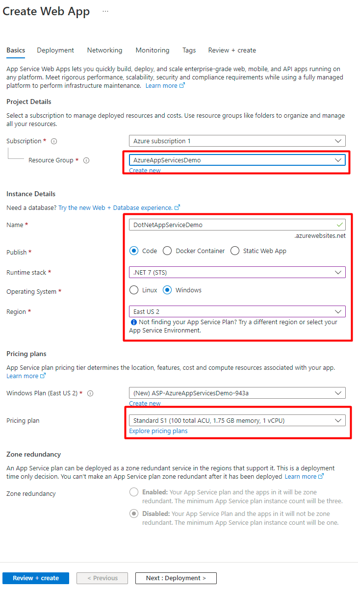 On the next page, select the Resource Group (or create a new one), inform the App Service name, select the Runtime stack, the Operating System you prefer, the Region, and the Pricing Plan and click on “Next: Deployment” to configure the other options if you need, or “Review + Create” to skip the others config: