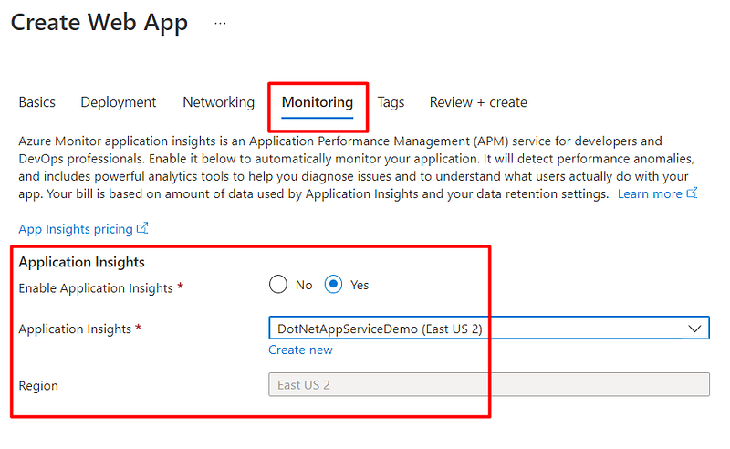- It’s also possible to enable Application Insights for the App Service (on the Monitoring page):