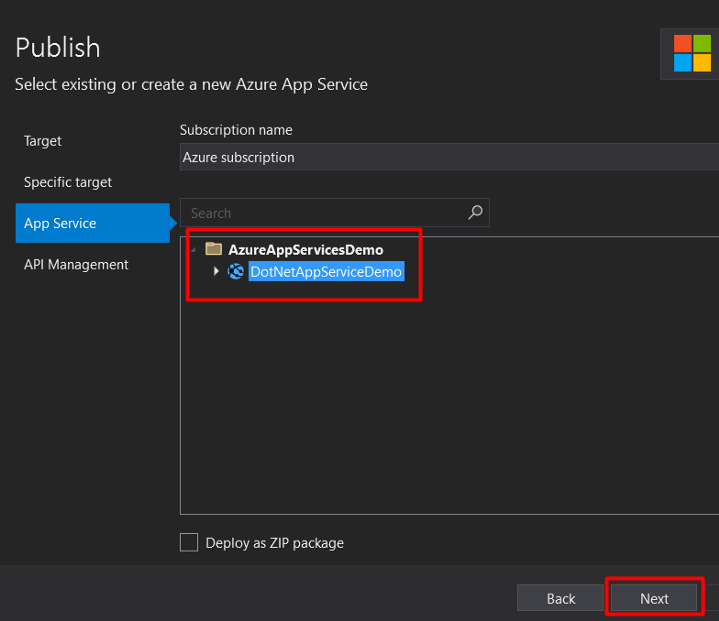 Authenticate with your Azure account and select the app service you would like to deploy, and select the Subscription and the App Service: