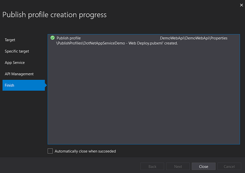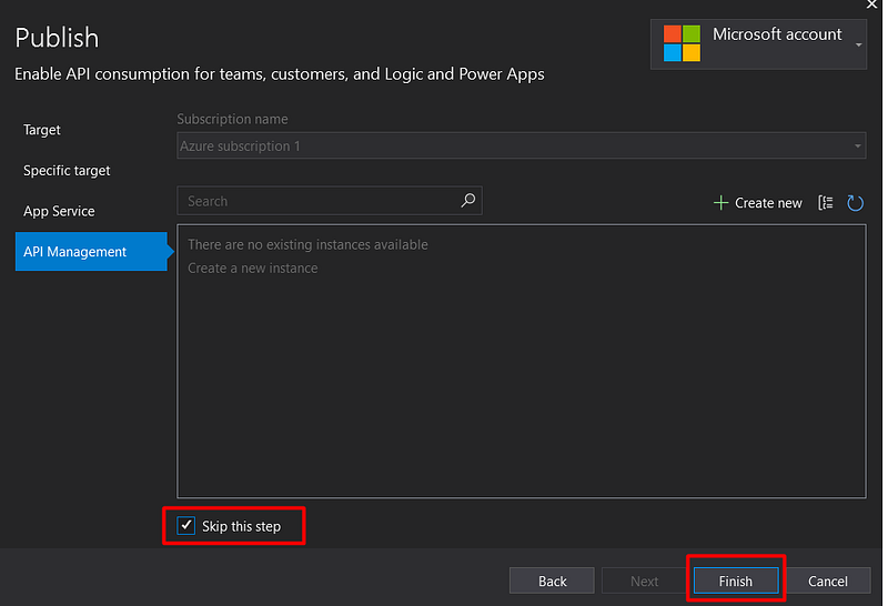 In the next step you can configure API Management (if you need it), otherwise check the “Skip this step” and click on “Finish”: