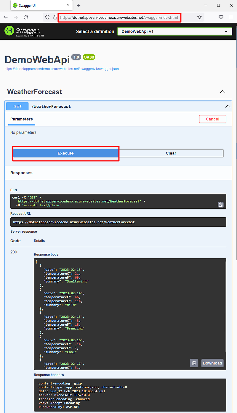 We can now access the Web API (remember to include the /swagger in the URL, and execute a request: