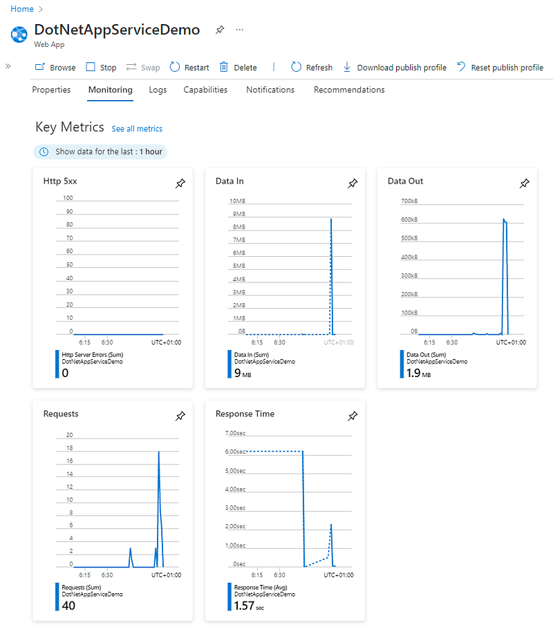After accessing the API and making some requests, let’s check the Monitoring charts in Azure Portal. Open the App Service and go to Overview, you should see some graphs: