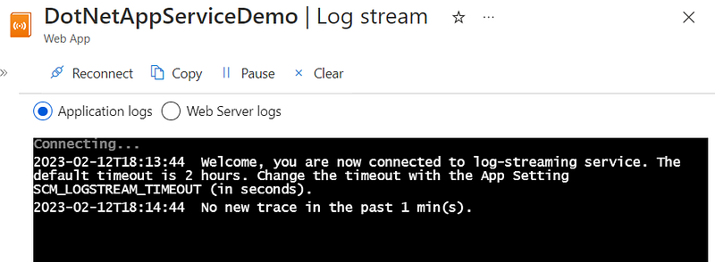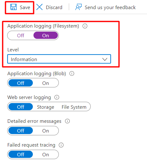 In Azure Portal, in the App Service, you can find the section “Monitoring” where you can see the “App Service logs” option: