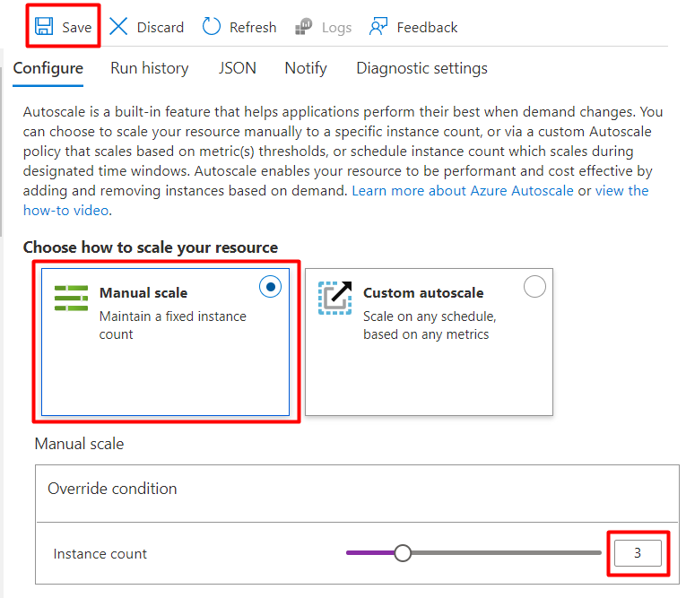 If you want to use Manual Scale, you just need to inform the number of instances that you want to have and click on Save: