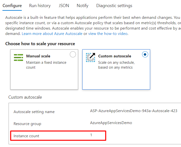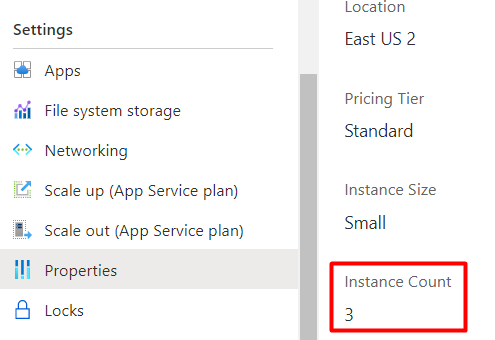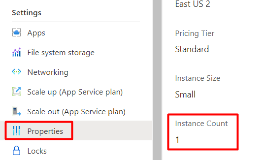 And now go to the “App Service Plan”, and select “Properties” (or check in the App Service on the Scale out page), and you can see that the “Instances Count” is now increased:
