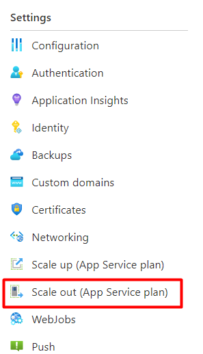 Let’s now enable autoscaling configuration. In the App Service page, in the** Settings menu**, go to Scale out (App Service plan):