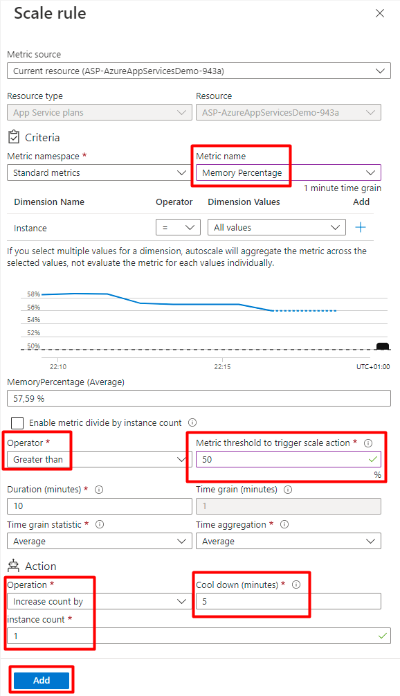 Note: I’m using these values to easily scale the app for demonstration purposes only. Please choose carefully the values in order to avoid conflicts of metrics (you can read more about it on this Microsoft’s documentation page).