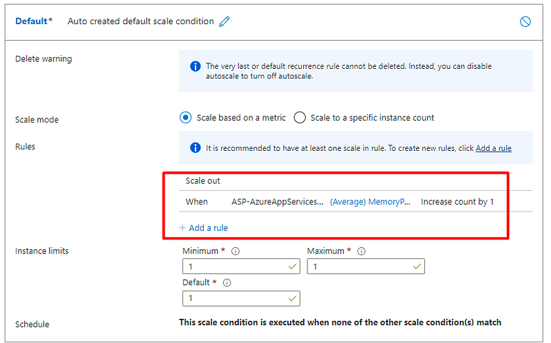 Now you can see the scale out rule that we just added. Let’s add a new rule for the scale in (click on “Add a rule”):