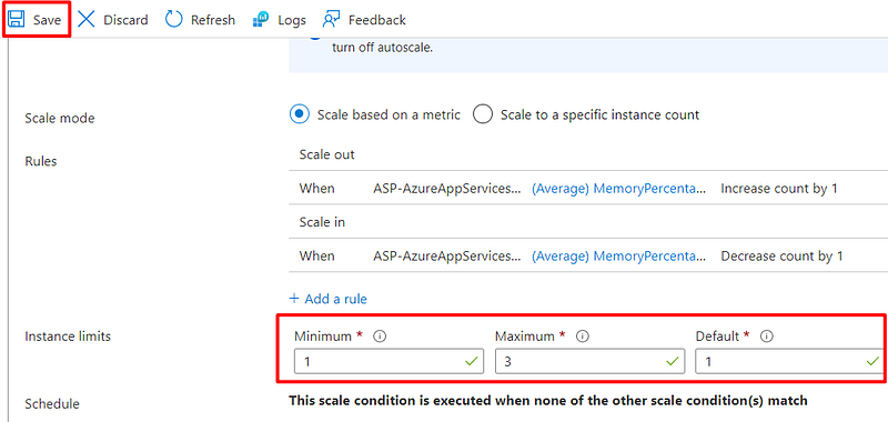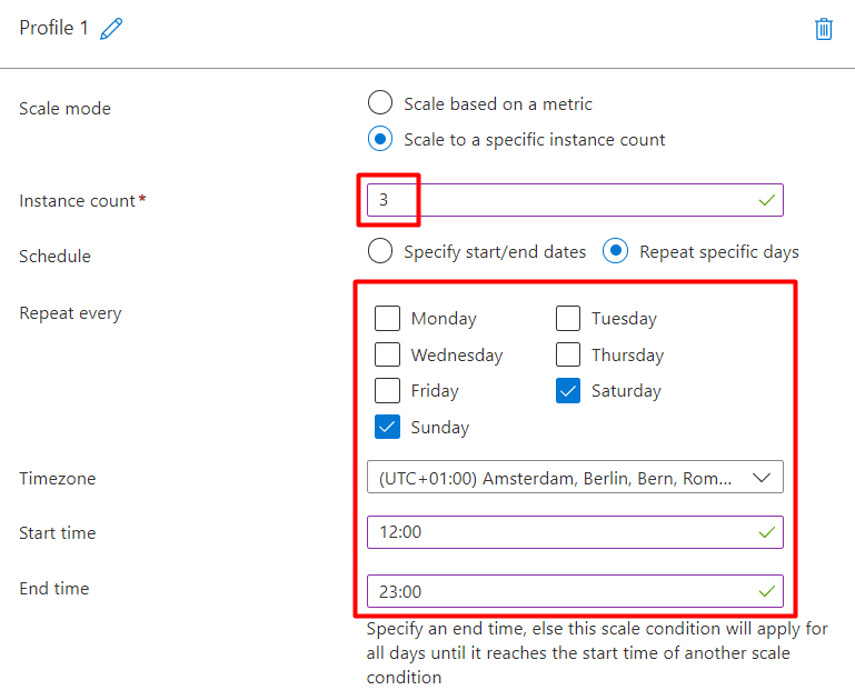 With this configuration, you can then set autoscaling for your app to scale during specific days and hours, for example, during the weekends, or some other specific schedule as you need. For that, on the “Scale out” page click on “Add a scale condition” and select “Scale to a specific instance count”, and let’s create a scale configuration to scale the app by 3 instances, on Saturdays and Sundays from 12:00 up to 23:00: