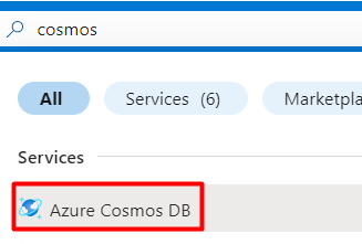 To create a Cosmos DB database, search for Cosmos DB in the Azure portal: