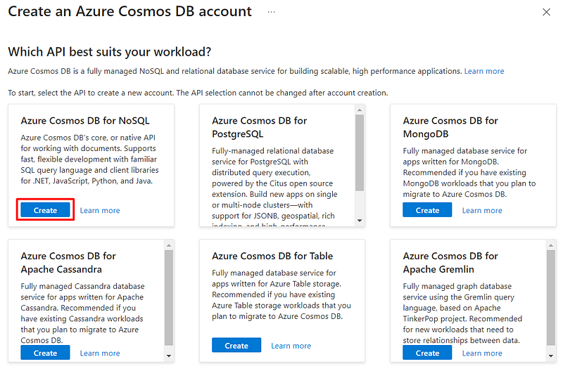 On the next page, you can select which type of Cosmos DB account you want. For this example, I selected the “Azure Cosmos DB for NoSQL”: