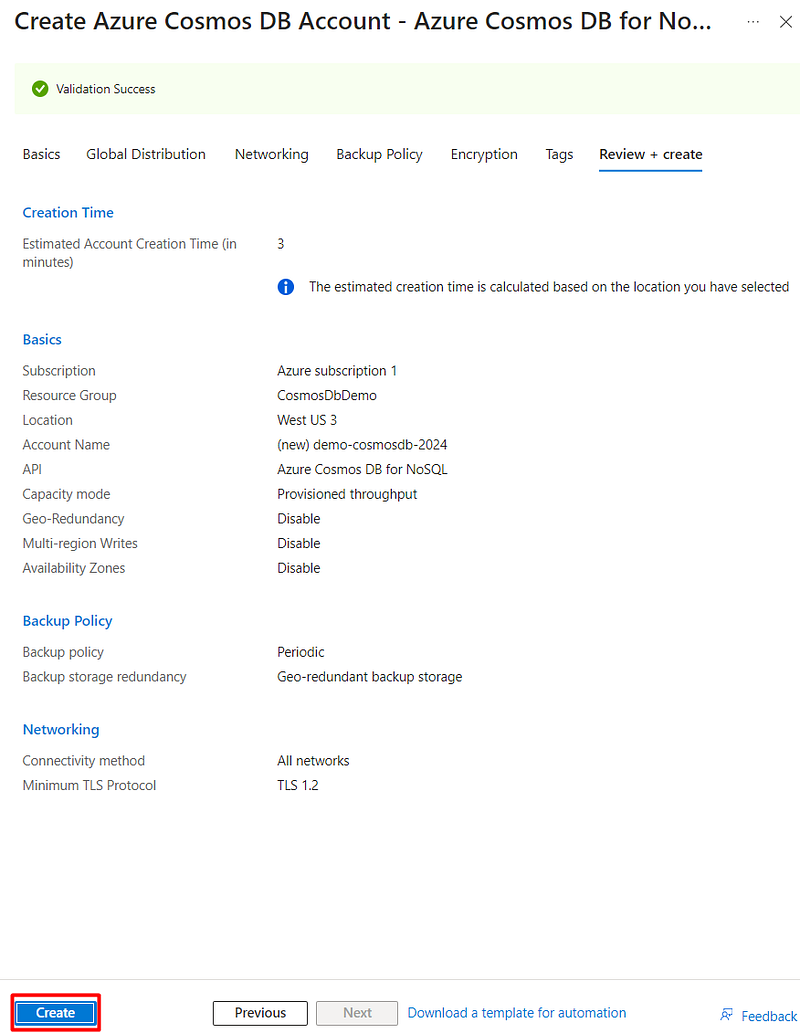 After clicking on “Review + create”, a validation will be run, and after that click in “Create” and your Cosmos DB account will be created: