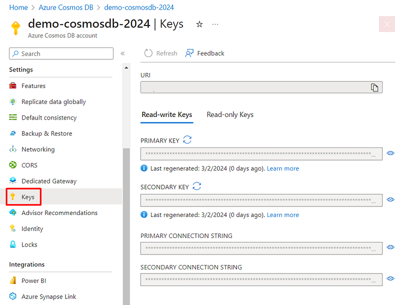 On the Keys page, is where you can find the connection strings for your Database. You can see Read-write Keys and Read-only Keys: