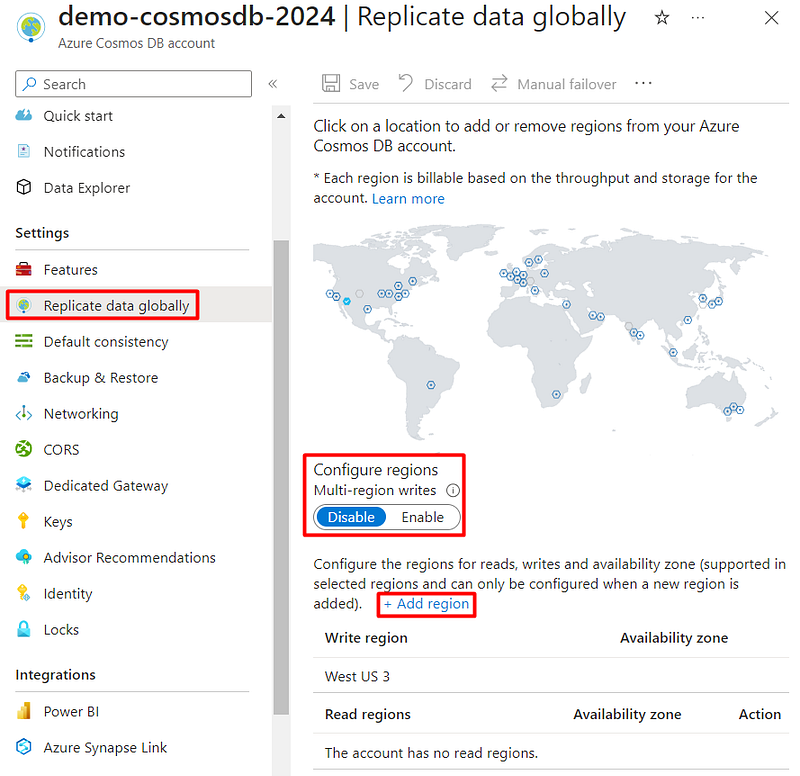 On this replication page, is where you can enable and configure geo-replication, which is a process that copies data across multiple Azure regions, providing both high availability and disaster recovery options for your Cosmos DB account. On this page, you can configure and add regions: