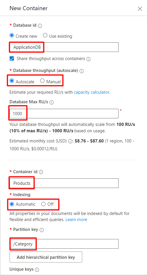 - Database throughput: This determines the capacity for handling read and write operations on the database (container). You can set it to automatically scale or to manual scaling.