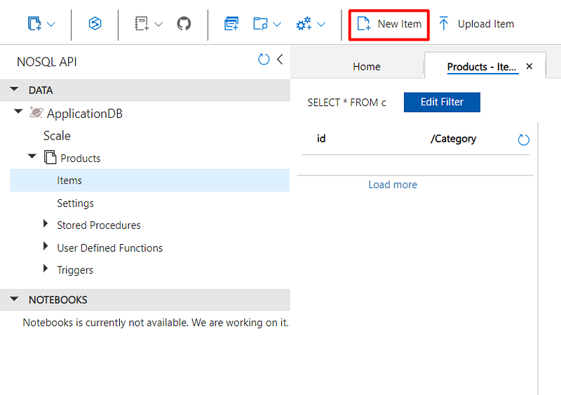 Below the container name, click on “Items”. As this was just created, it will be empty. You can click on “New Item” to add a new document to the container: