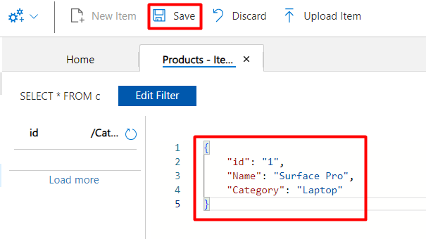 A default template with an id property will be created, you can add the properties you want. The id property is required and it is used to identify a document in a logical partition. If you don’t provide an id, a GUID value will be automatically added as the id. After adding the values you want, click on “Save”: