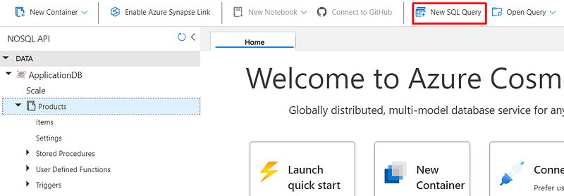 For demonstration purposes, I added a few more items in the container, in order to demonstrate how to query the data. For that, still in the Data Explorer page, click on “New SQL Query”: