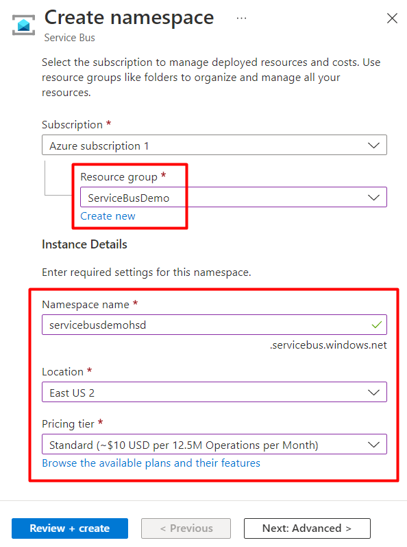 Select the Resource group, add a Namespace name, select the Location and the Pricing tier and click on “Review + Created” and then “Create”:
