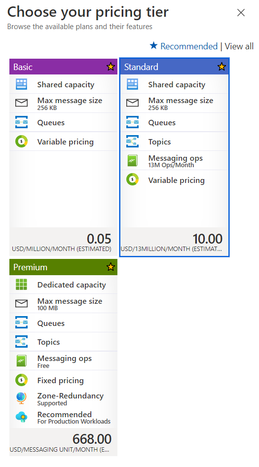 If you click on “Browse the available plans and their features”, you can see the pricing tier and what feature each plan offers. Since I’m going to use Queue and Topics for the examples in this article, I selected the “Standard” option: