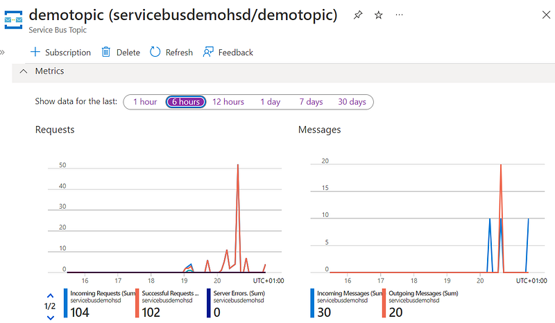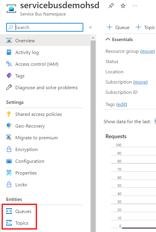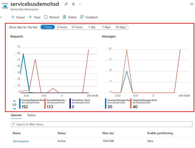 Note that you can also make use of Monitor features, and see requests and messages in the charts available on the Service Bus page.