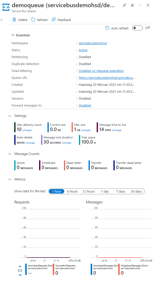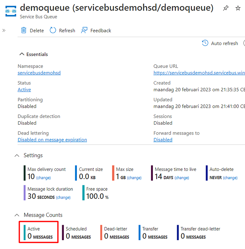 And back to Azure Portal, there will be 0 Active messages: