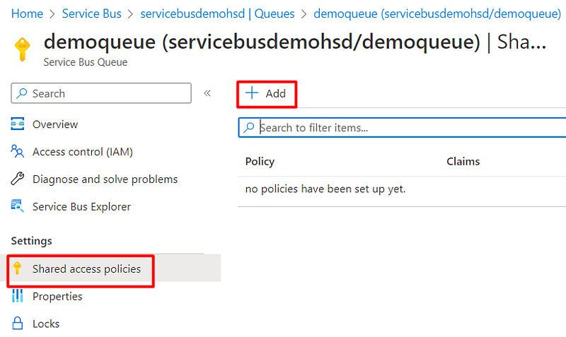 We also need to create a “Shared access policies” (SAS), with that you can set policies for Manage, Send and Listen to queue messages. On the Queue page, go to “Shared access policies” and add a new policy: