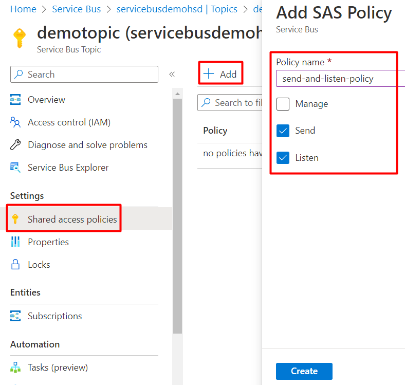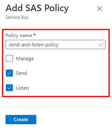 For demonstration purposes, I’m creating a single policy for “Send” and “Listen”, but in a production environment, it’s better to have separated policies: one for “Send”, and one for “Listen”: