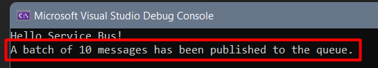 Console.WriteLine($"A batch of {_numberOfMessages} messages has been published to the queue.");