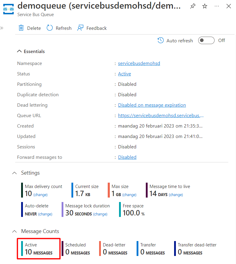 In Azure Portal, on the queue page, you should see the 10 Active Messages that were just sent:
