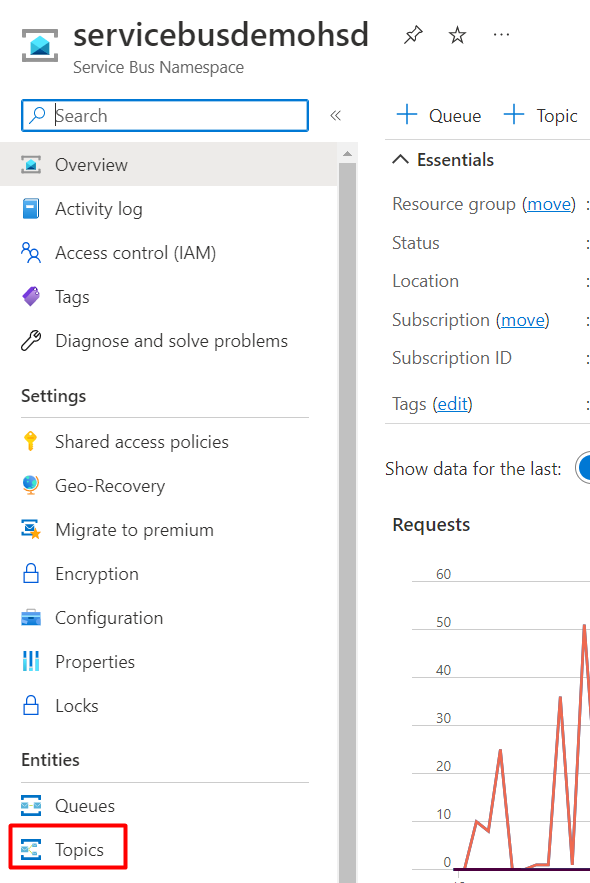 On the Service Bus page, you can see the options for Queues and Topics: