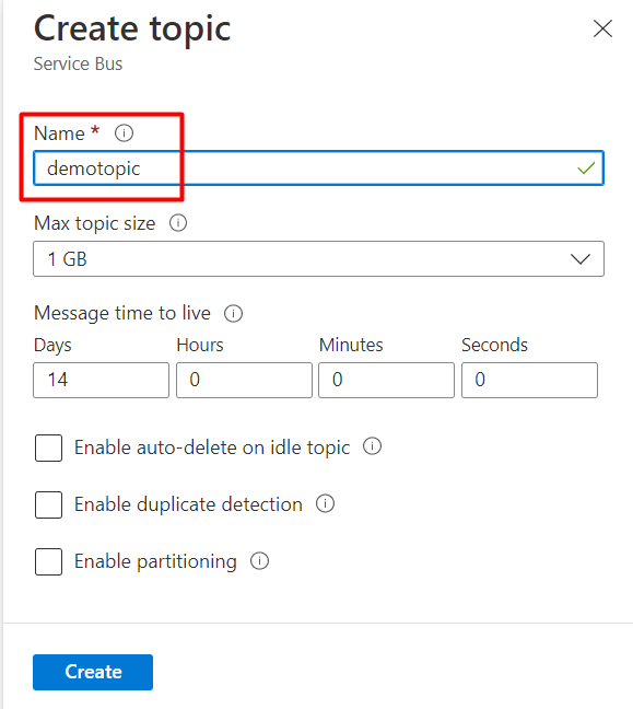 In the next step, you need to inform a name for the Topic, and you can configure the queue options and click on “Create” (for this demo, I kept the default configuration):