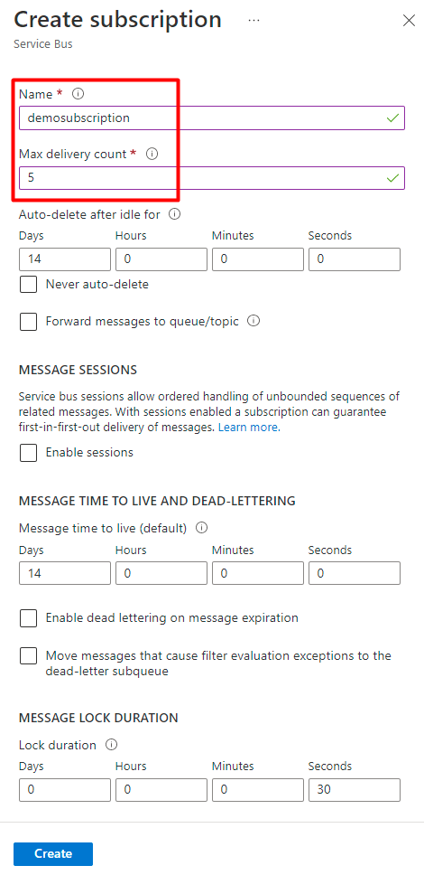 In the next step, you need to inform a name for the subscription and inform a Max delivery count (this means that for every delivery of a message, the delivery will be tried for maximum X times, and if it is not delivered after X attempts, it will be a fail delivery), and you can configure the other subscription options and click on “Create” (for this demo, I kept the default configuration):