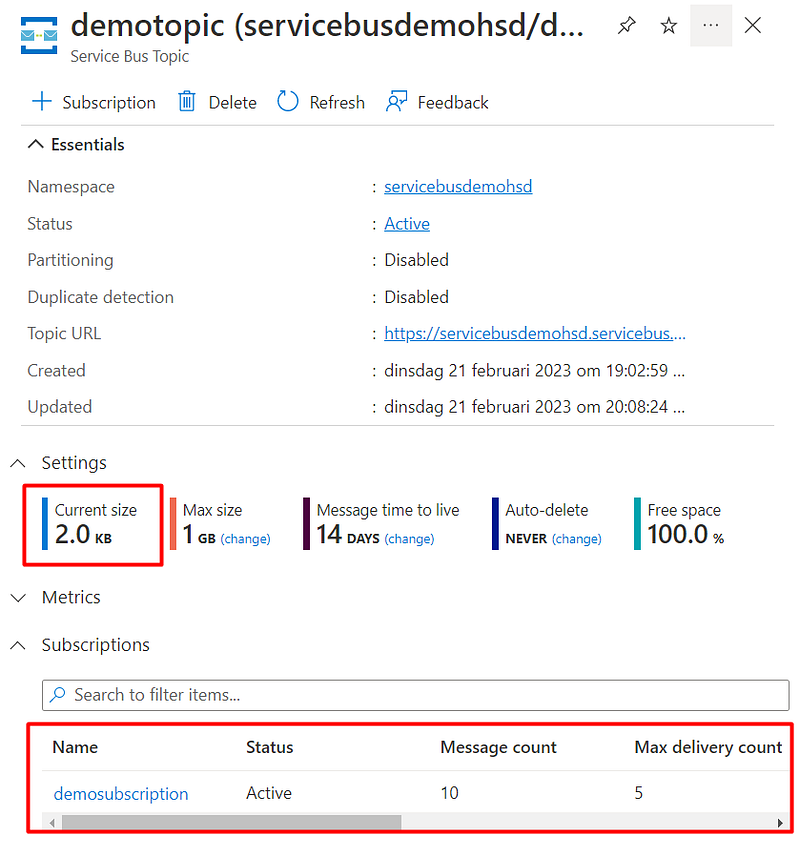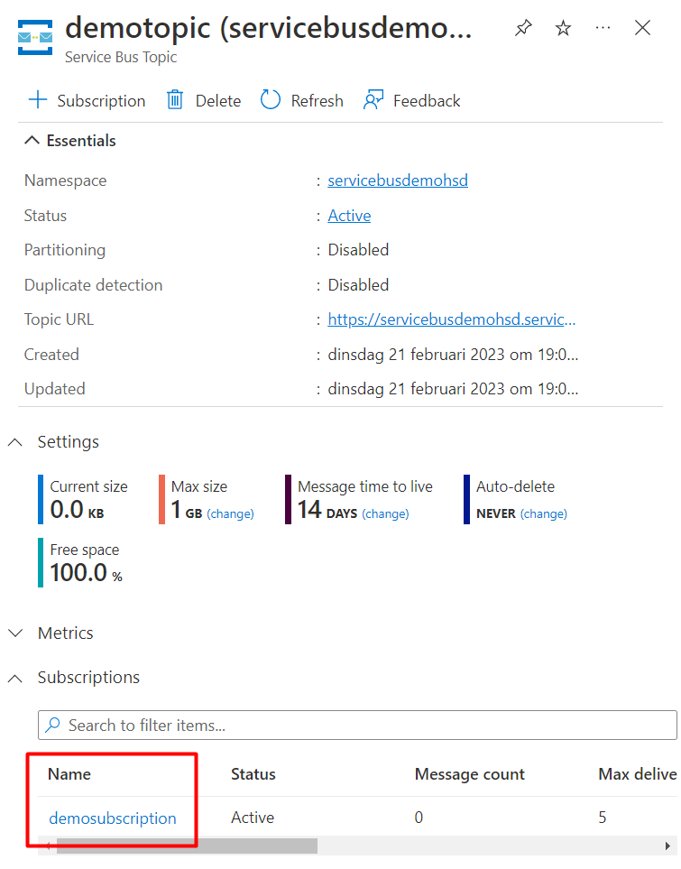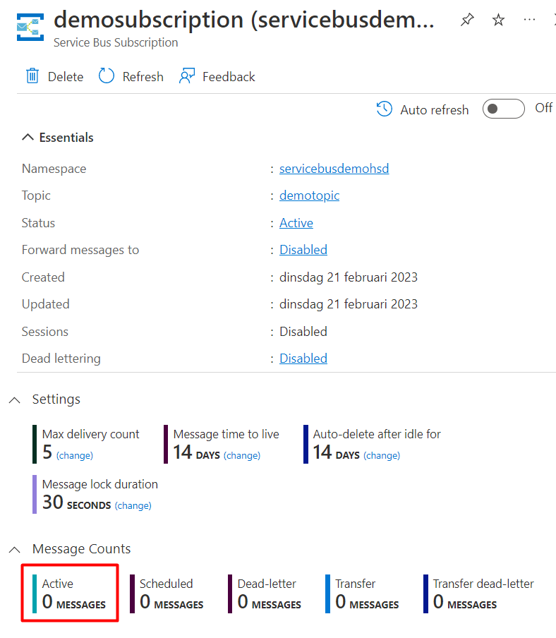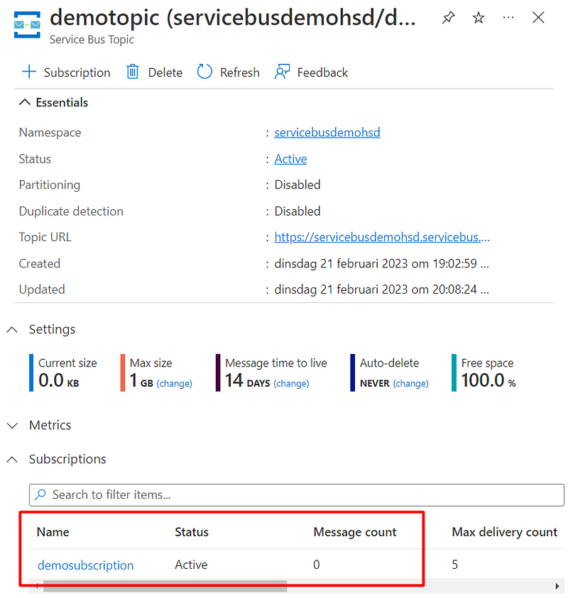 And back to Azure Portal, there will be 0 Active messages (Topic and Subscription pages):