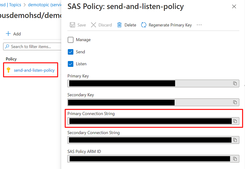 Then click on the created policy and get the Connection String, we will need it in the .NET app: