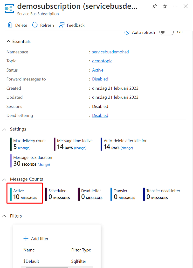 If you want to know more about filters, check Microsoft’s documentation page about “Set subscription filters (Azure Service Bus)”.
