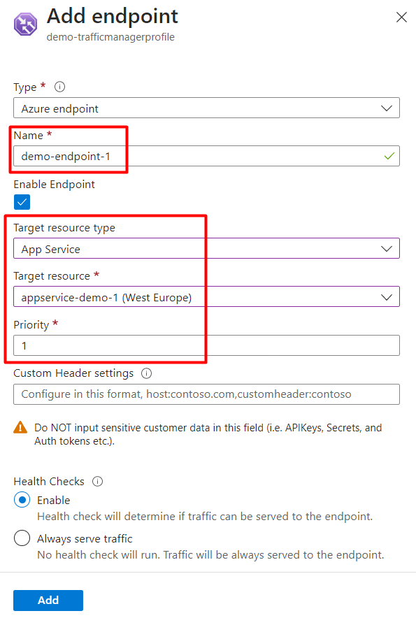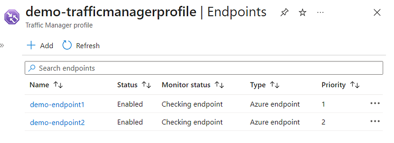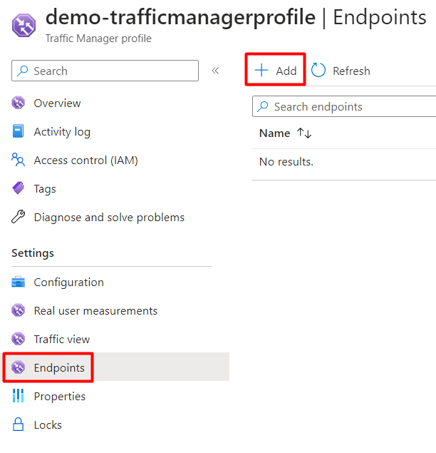 After your Traffic Manager profile is created, you need to create the Endpoint. For that, go to the service and select “Endpoints” and click on “Add”: