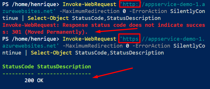 Invoke-WebRequest 'https://appservice-demo-1.azurewebsites.net' -MaximumRedirection 0 -ErrorAction SilentlyContinue | Select-Object StatusCode,StatusDescriptionBut when trying without HTTPS, got 301 (Moved Permanently):