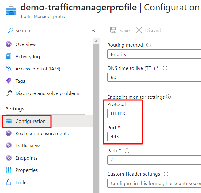 To configure HTTPS, in the Traffic Manager profile, go to the Configuration page and update the Protocol to HTTPS and the Port to 443: