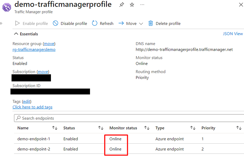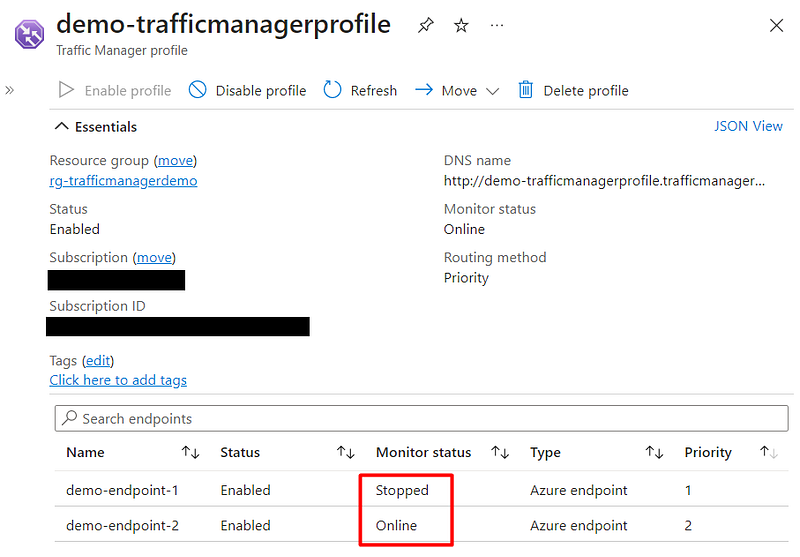 Then you should see in Traffic Manager that endpoint 1 has Monitor status “ Stopped” and endpoint 2 has the status “Online”: