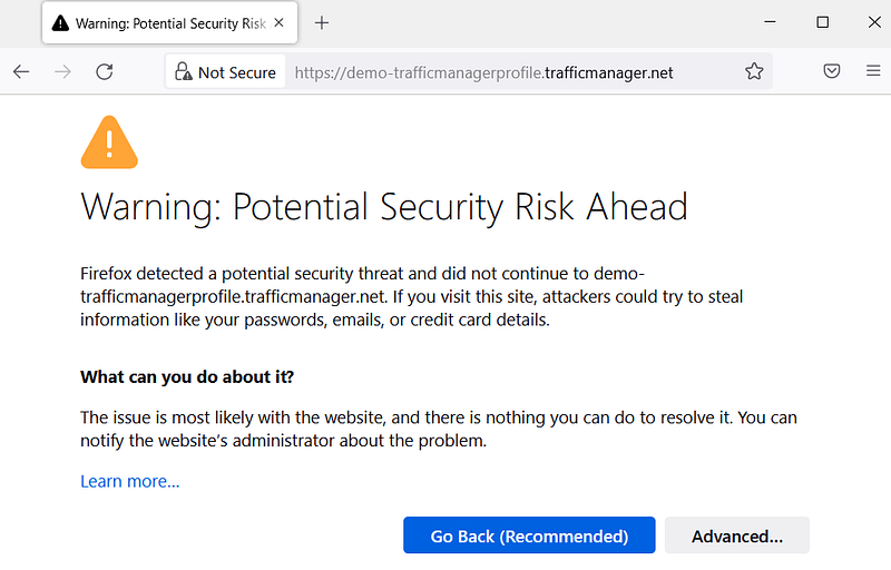 If you get the DNS from Traffic Manager and try to access it, it will complain about not being secure: