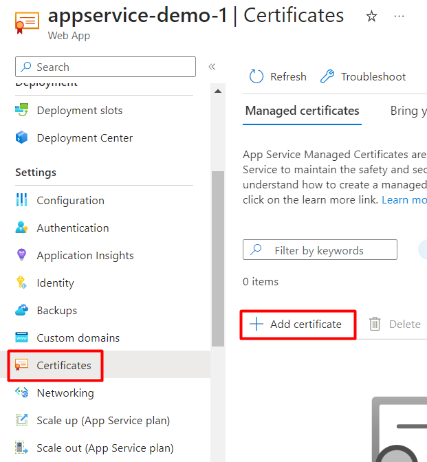 To configure the certificate for the App Services, go to the App Service 1, and open the certificates page and click to add a new certificate: