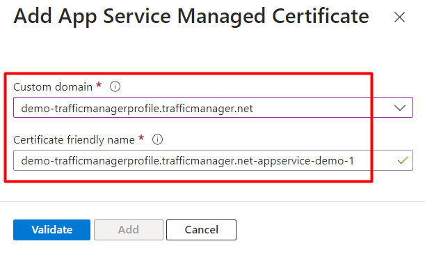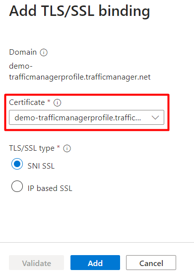 Then select the Custom domain and the Certificate friendly name and click on Validate, and then click on Add: