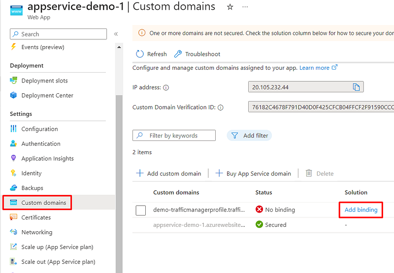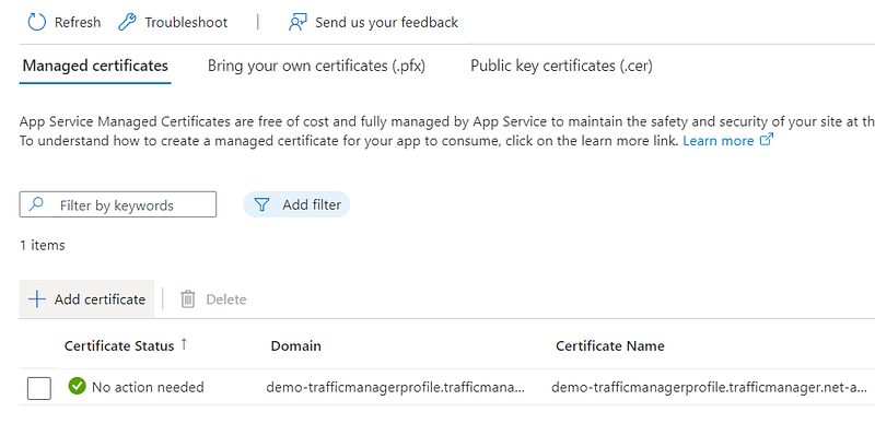 To fix that, we need to configure the App Services Certificates, which is exactly what we are going to do next.