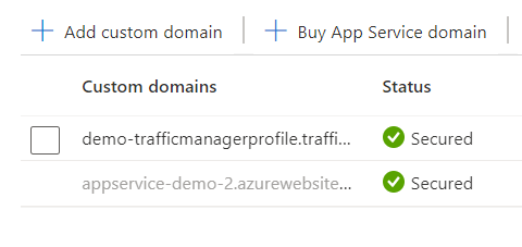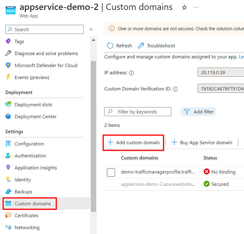 Now that you already have a certificate, you don’t need to create it again for App Service 1, however, you need to configure it to the custom domain. For that, go to the App Service 2, and go to the “Custom domains” page, and click on “Add custom domain”: