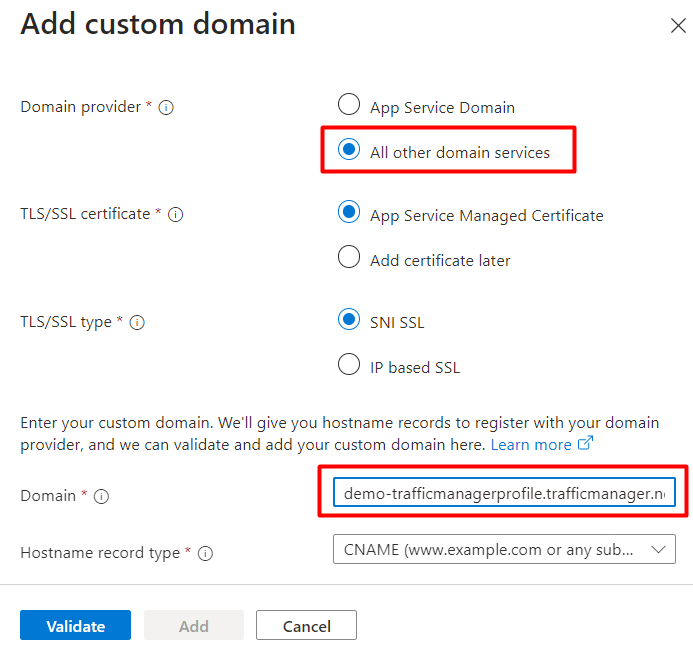 Then on Domain provider select “All other domain services” and in the “Domain” add the DNS from Traffic Manager (in this example is demo-trafficmanagerprofile.trafficmanager.net):