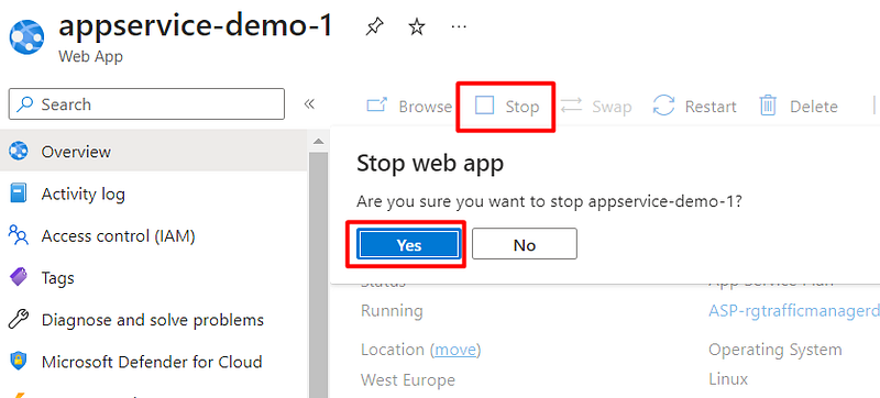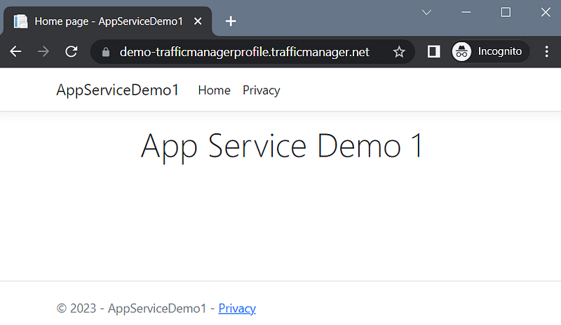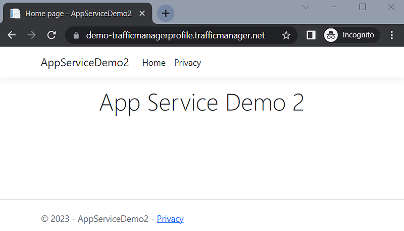 Try to access the app using the Traffic Manager DNS (ttps://demo-trafficmanagerprofile.trafficmanager.net/) again, and you will be redirected now to App Service 2: