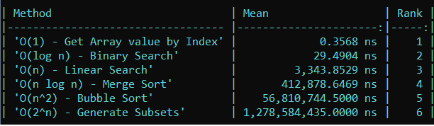 | 'O(2^n) - Generate Subsets' | 1,278,584,435.0000 ns | 53,516,114.1767 ns | 157,793,470.0977 ns | 1,196,049,200.0000 ns | 6 |Conclusion