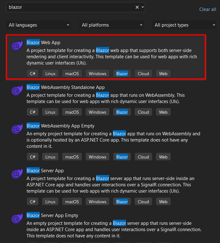For demonstration purposes, I created a Blazor Web App using the Visual Studio 2022 Preview version. To create a Blazor Web App on VS, select the option to create a new project, search for “Blazor” and select the “Blazor Web App” template: